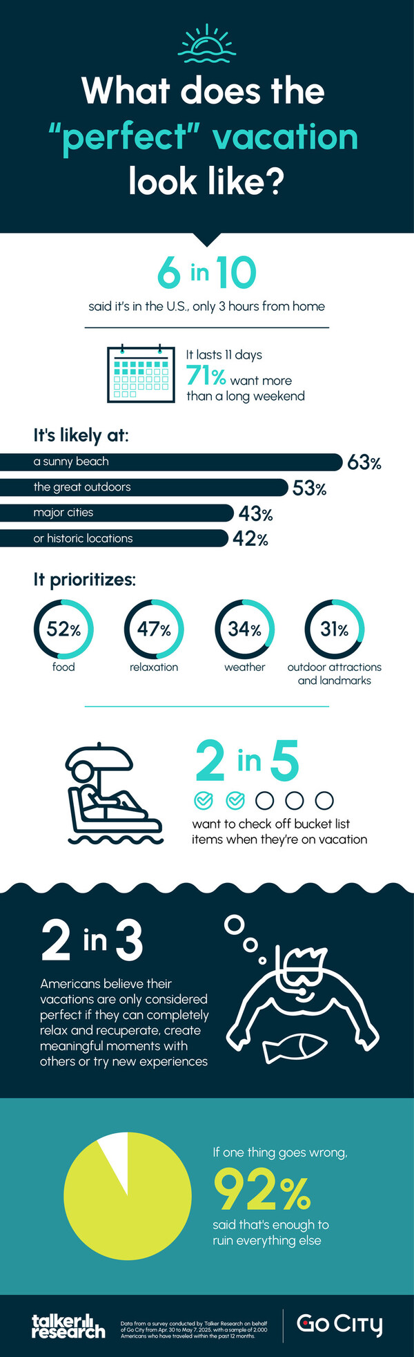 NEW YORK, May 21, 2025 /PRNewswire/ -- Today, Go City—the world's leading sightseeing and attraction pass brand—released the results of a new consumer survey, revealing the hallmarks of the "perfect" vacation and the sacrifices Americans are willing to make to guarantee perfection. Conducted by Talker Research, the survey polled 2,000 travelers—U.S. residents who have traveled within the past year—and found that the perfect vacation lasts 11 days, is at least three hours from home, and prioritizes food (52%), relaxation (47%), good weather (34%), accommodations (38%), as well as outdoor attractions and landmarks (31%).